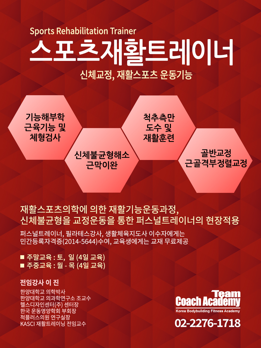 재활포츠재활트레이너 자격과정 SPORTS REHABILITATION TRAINER COURSE 올바른 근골격 검사와 진단으로 통증관련 원인을 분석하고, 근육조직의 이완과 Mobility를 극대화하여 관절의 가동성회복과 재활운동으로 정상 회복을 하기 위함이다. 신체불균형을 바로잡고 소도구활용과 올바른 웨이트트레이닝으로 통합적인 재활트레이닝을 목표로하는 교육 ✔교육대상 - 퍼스널트레이너, 보디빌딩피트니스선수,필라테스, 요가지도자 물리치료사, 운동선수 ✔교육기간 5월 9,10,16일 (주말교육) 12:00~17:00 접수중 ✔교육비/ 68만원(부가세는 없음)