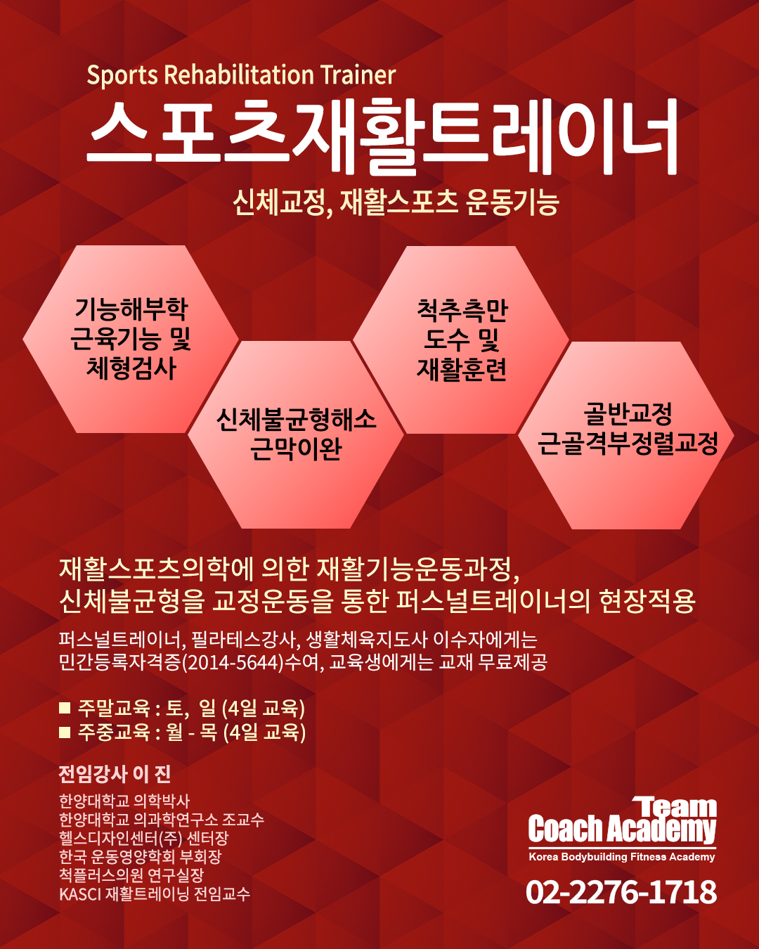 재활운동교재(4만원)무료지급, 공인민간등록 재활스포츠트레이너 자격증 수여